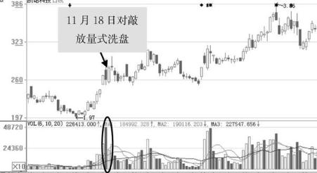 所谓对敲放量式洗盘就是当股价被拉升到一定高度后,散户就会担心股价回调,主力借机对敲,使股价在相对高位放出巨量,有时还会故意高开低走收出大阴线,使散户误以为主力要出货了,从而纷纷抛出股票。