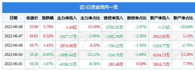 资金流向数据方面,6月8日主力资金净流入1.44亿元,游资资金净流出2702.92万元,散户资金净流出1.17亿元。