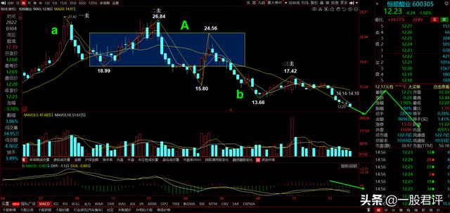 最后看看日线图,恒顺醋业在周线级别的最后一笔,在日线级别走了一个中枢的下跌走势,离开段b的下跌幅度比进入段a大得多,很明显没有背驰,后面即使有反弹也不是买点。当然这个离开段b下跌幅度很大,距离中枢A的下沿很远,后面反弹的幅度可能会比较大,可以用30分钟第一类买点入场,做一段30分钟的上涨趋势,但是要时刻守住一条线,就是下跌趋势只能做反弹,30分钟出现第一类卖点就要走人。