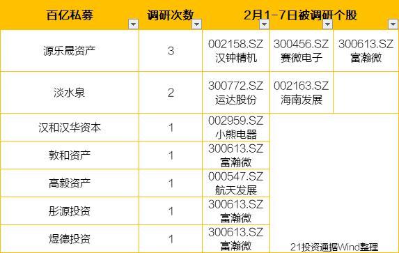从具体调研机构来看,源乐晟资产、淡水泉、敦和资产、高毅资产等7家百亿知名私募调研了7家公司。其中,芯片概念股富瀚微(300613.SZ)最受关注,获得源乐晟资产、敦和资产、彤源投资、煜德投资4家百亿私募青睐。