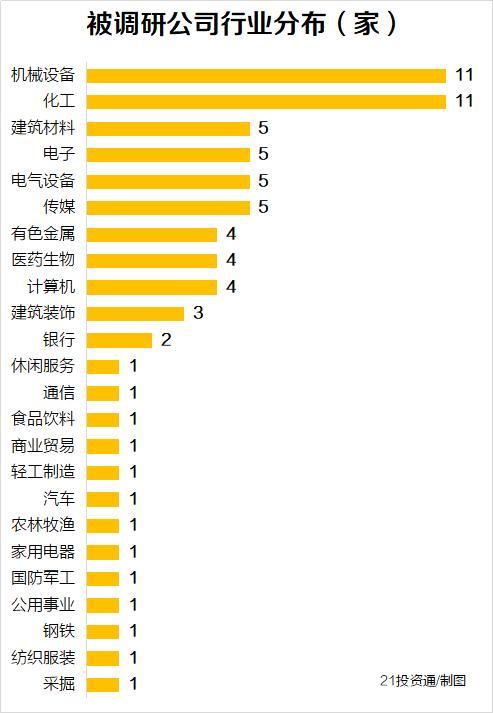 从行业分布来看,化工、机械设备最受机构青睐,均有11家相关公司被调研,其次是电子、建筑材料、电气设备、传媒行业,均有5家以上公司获调研。