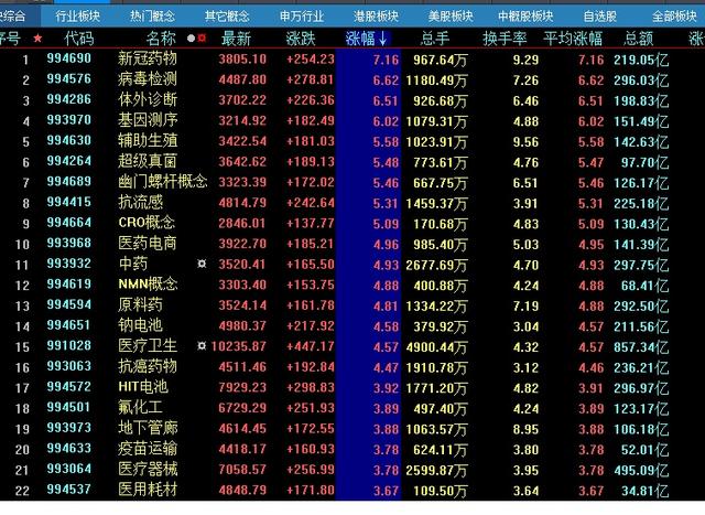 盘面上看,医药、化纤、酿酒板块强势拉升,航空、建材、化工、地产、建筑、汽车、钢铁、金融等板块均上扬;新冠药、新冠检测概念午后爆发,辅助生殖、CXO概念、氟概念、锂矿、光伏、储能、锂电池概念等均走强。