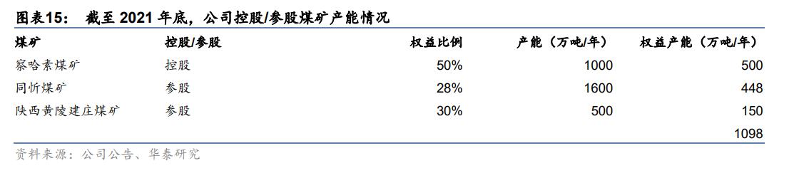 公司拥有控股煤矿产能 1000 万吨,权益煤矿产能 1098 万吨。察哈素煤矿公司为公司控股 子公司,即公司拥有控股煤矿产能 1000 万吨/年。除煤矿收入占比超过电力收入占比的上 市电力公司外,公司应该是控股煤矿产能仅次于内蒙华电(扩产后可达 1200 万吨/年)的 电力上市公司。即使公司预计察哈素煤矿每年产出商品煤约 950 万吨,仅 260-300 万吨自 用,大多数外销。但我们认为煤炭外销价格与公司采购价格关联性较大,拥有煤矿产能或 等同于缩小煤炭需求缺口。