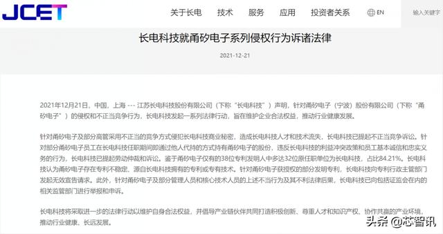 12月21日消息,国产半导体封测大厂江苏长电科技股份有限公司(以下简称“长电科技”)今天通过官网发布声明称,针对甬矽电子(宁波)股份有限公司(以下简称“甬矽电子”)的侵权和不正当竞争行为,长电科技已发起一系列法律行动,旨在维护企业合法权益,推动行业健康发展。