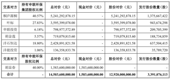 具体来看,浙富控股拟以发行股份的方式向桐庐源桐、叶标、申联投资、胡金莲、沣石恒达、沣能投资等6名交易对方购买其持有的申联环保100%股权,以支付现金的方式向胡显春购买其持有的申能环保40%股权。