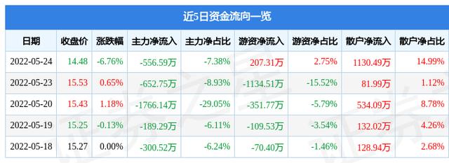 资金流向数据方面,5月24日主力资金净流出556.59万元,游资资金净流入207.31万元,散户资金净流入1130.49万元。
