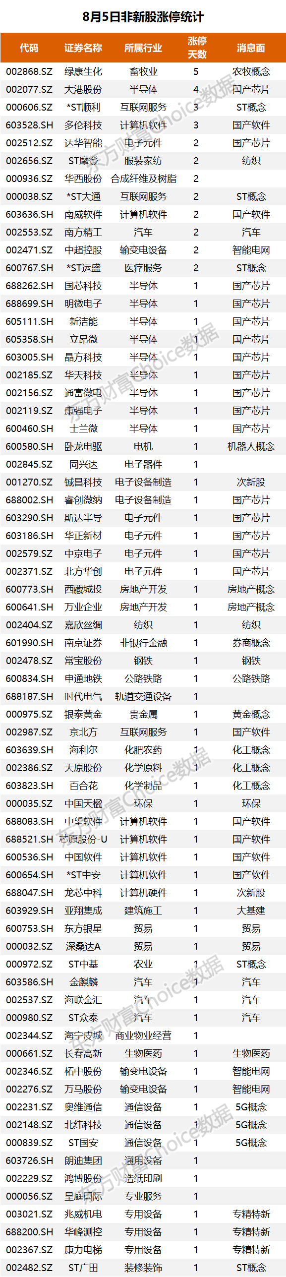 8月5日非新股涨停统计