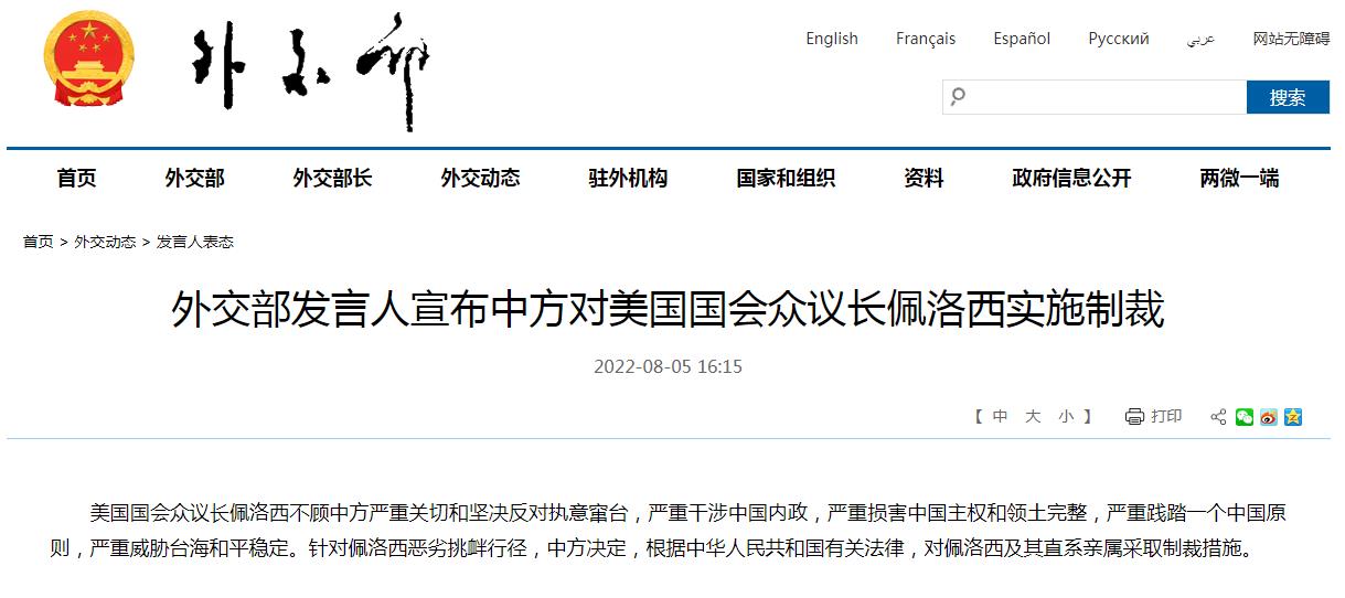 美国国会众议长佩洛西不顾中方严重关切和坚决反对执意窜台,严重干涉中国内政,严重损害中国主权和领土完整,严重践踏一个中国原则,严重威胁台海和平稳定。针对佩洛西恶劣挑衅行径,中方决定,根据中华人民共和国有关法律,对佩洛西及其直系亲属采取制裁措施。