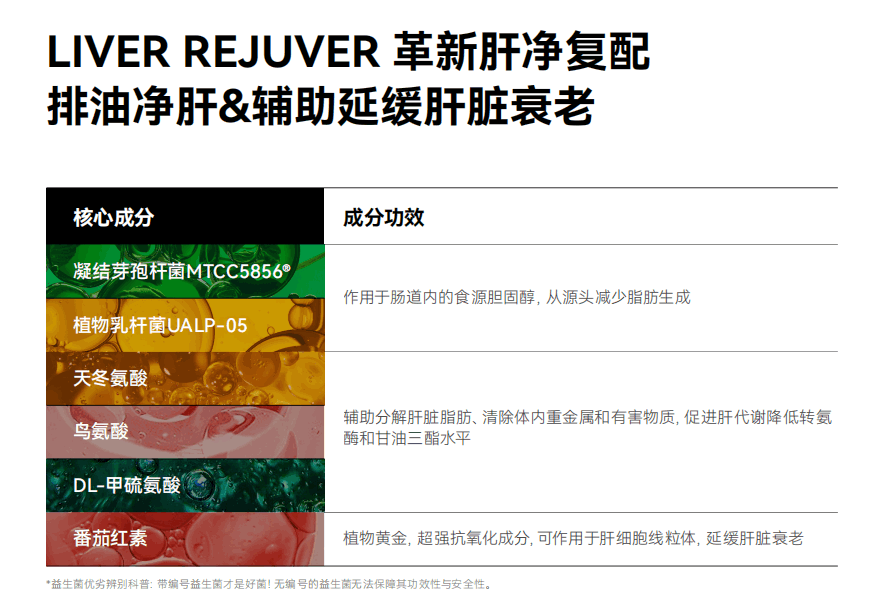 例如在LAIFE「乐轻肝」的研发过程中,RevOrgan™平台通过对肝脏问题分析,锁定肠肝受体靶点以后,就采用AI算法遍历数以万计益生菌成分,最终锁定凝结芽孢杆菌MTCC5856与植物乳杆菌UALP-05的组合。这两种国家认证菌株具备极强的耐高温、耐胃酸、耐胆汁特性,可在肠道内定植形成“油脂滤网”,高效分解胆固醇并转化为短链脂肪酸,从源头减少脂肪进入肝脏的量,为肝脏树立起一道防火墙。