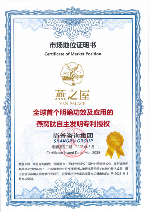 图:燕之屋获得“全球首个明确功效及应用的燕窝肽自主发明专利授权”认证