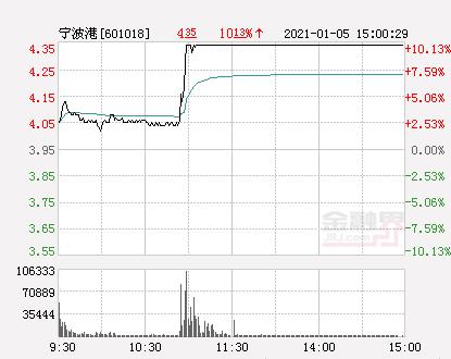 金融界网1月5日消息,今日宁波港开盘报4.05元,截止11:05分,该股涨10.13%报4.35元,封上涨停板。