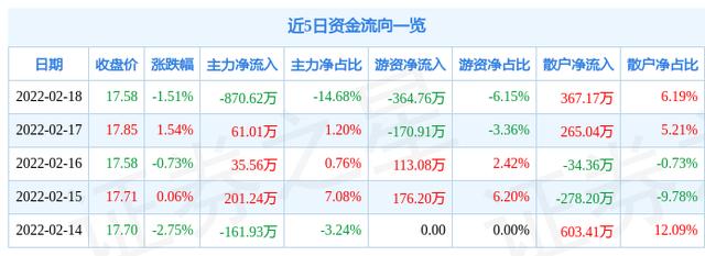 资金流向数据方面,上个交易日主力资金净流出870.62万元,游资资金净流出364.76万元,散户资金净流入367.17万元。近5日资金流向一览见下表: