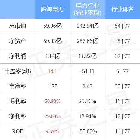 黔源电力主要指标及行业内排名如下: