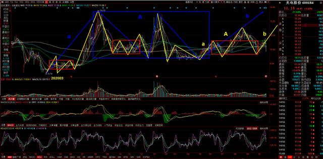 再看看日线图,光电股份在2020年3月创出低点8.74元后的走势如图,黄色线是日线级别的走势划分,蓝色是周线级别的走势划分。从周线级别看能大致画出图示的5笔线段,可以看做是一个中枢a+A+b的上涨结构,目前正在走的是离开段b或者是中枢延伸的下一笔上涨。从日线级别看,在8.74元低点后的第一个上涨中枢,其上涨幅度非常大,而且在后面回调是这个中枢的上沿一直没有被跌破,可见8.74元底部非常确认。现在正在走的周线级别的一笔上涨线段,在日线级别也表现为一个中枢a+A+b的上涨结构,这部分的形态很不错,上涨线段一笔比一笔强,回调点位一次比一次高,虽然这周三四有大幅度回撤,但周五又大阳线收回站上20日线,可以说形态保持的比较好,继续上涨的概率很大,所以这一笔周线级别的上涨线段最少看到中枢A的上沿。