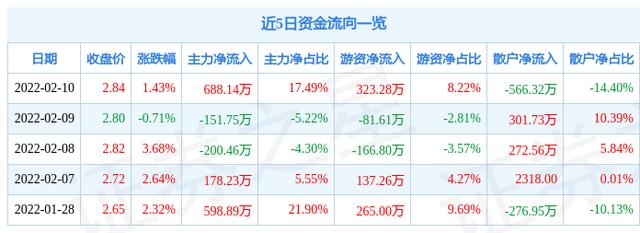 资金流向数据方面,上个交易日主力资金净流入688.14万元,游资资金净流入323.28万元,散户资金净流出566.32万元。近5日资金流向一览见下表: