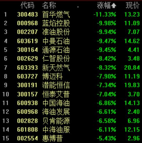 首华燃气跌超11%,蓝焰控股、准油股份触及跌停,仁智股份、通源石油、恒泰艾普、潜能恒信、中曼石油等跌超6%。