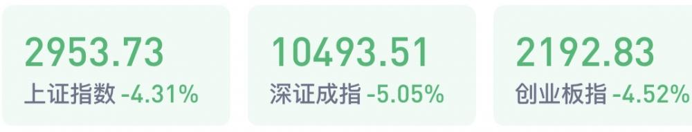4月25日盘中,三大指数集体跌超4%,两市超4500股飘绿,近300股跌停或跌幅超10%。沪指跌4.31%,深成指跌5.05%,创业板指跌4.52%。