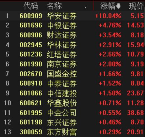 华安证券涨停,中银证券、财达证券、华林证券、红塔证券等跟涨。