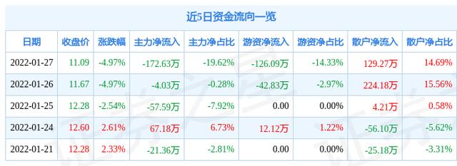 资金流向数据方面,上个交易日主力资金净流出172.63万元,游资资金净流出126.09万元,散户资金净流入129.27万元。近5日资金流向一览见下表: