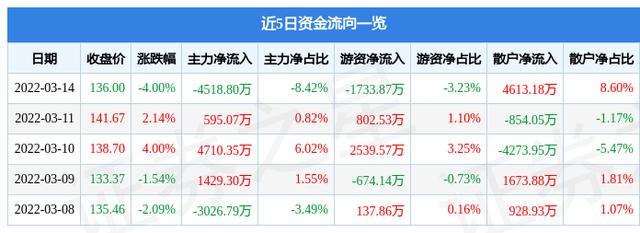 资金流向数据方面,上个交易日主力资金净流出4518.8万元,游资资金净流出1733.87万元,散户资金净流入4613.18万元。近5日资金流向一览见下表: