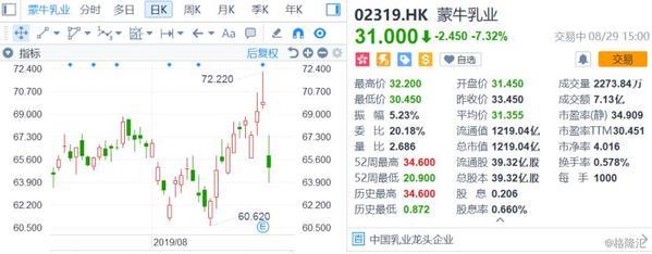 8月28日晚间,蒙牛乳业(02319.HK)发布了2019年上半年业绩报告。可令人想不通的是,营收净利双双实现了增长的它,却引发了股价大跌——8月29日,蒙牛低开近6%,截止发稿该股价大跌7.32%至31港元,为今日蓝筹股跌得最惨的一只。