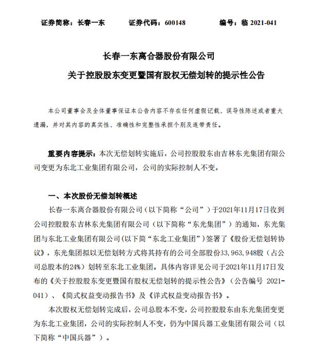 17日,长春一东发布公告, 长春一东离合器股份有限公司(以下简称“公司”)于2021年11月17日收到公司控股股东吉林东光集团有限公司(以下简称“东光集团”)的通知,东光集团与东北工业集团有限公司(以下简“东北工业集团”)签署了《股份无偿划转协议》,东光集团拟以无偿划转方式将其持有的公司全部股份33,963,948股(占公司总股本的24%)划转至东北工业集团。