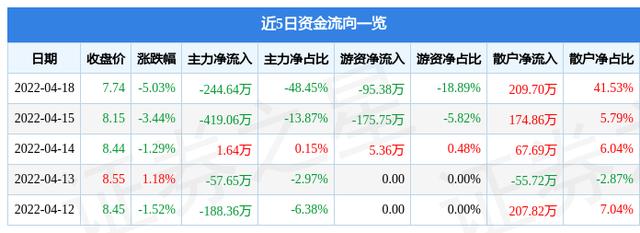 资金流向数据方面,上个交易日主力资金净流出244.64万元,游资资金净流出95.38万元,散户资金净流入209.7万元。近5日资金流向一览见下表: