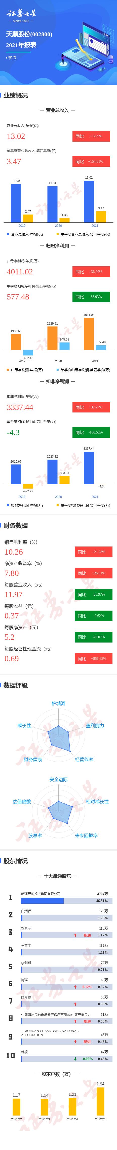 天顺股份(天顺股份股吧)天顺股份2021年报显示,公司主营收入13.02亿元,同比上升15.09%;归母净利润4011.02万元,同比上升36.9%;扣非净利润3337.44万元,同比上升32.27%;其中2021年第四季度,公司单季度主营收入3.48亿元,同比上升154.61%;单季度归母净利润577.49万元,同比下降38.93%;单季度扣非净利润-4.31万元,同比下降100.52%;负债率44.88%,投资收益-367.84万元,财务费用1576.33万元,毛利率10.26%。本期共有3个新进十大流通股东,赵素菲 持股118.125万股,占流通股比例1.17%,中国国际金融香港资产管理