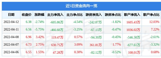 资金流向数据方面,当日主力资金净流出605.86万元,游资资金净流出242.87万元,散户资金净流入1605.43万元。近5日资金流向一览见下表: