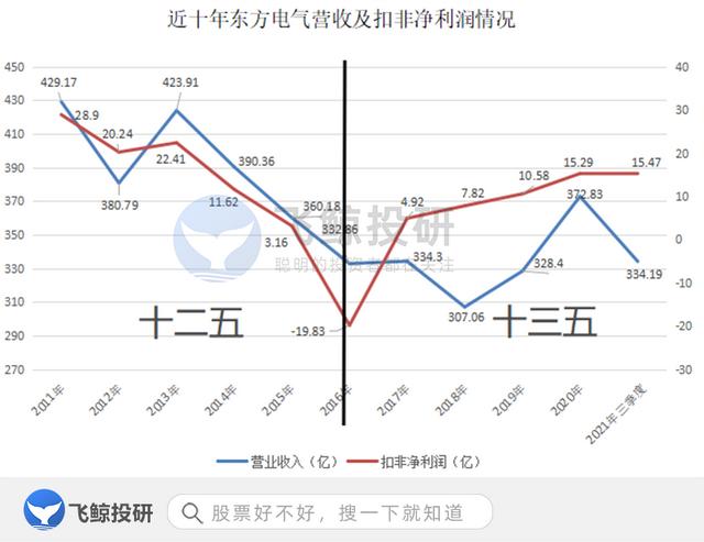 2011年—2015年(十二五期间):随着全球能源变革,煤电设备需求逐步萎缩,此后,日本地震导致福岛核泄漏,核电订单骤减,国际国内形势持续低迷,从而致使东方电气持续亏损,扣非净利润大幅下降,甚至在2016年出现负值。