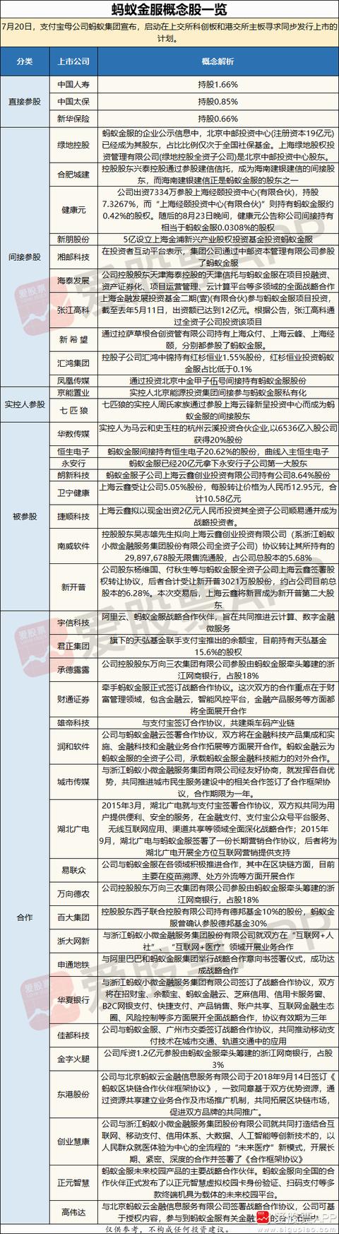 蚂蚁金服概念股(蚂蚁金服概念股龙头)1、今晚最大的新闻是关于蚂蚁集团要在科创板和港股同时上市的。传了无数次,终于官宣了!2015年牛市时,就传说上海要搞战略新兴板,蚂蚁集团就是给战略新兴板准备的;结果牛市来的快、去的更快,最后就这么一直拖着。蚂蚁集团因为涉及到国家的金融安全,掌握着几亿人的金融数据;加上过去一直吐槽的国内优质公司都去海外上市了,A股剩下的全是垃圾,所以蚂蚁集团这样的优质企业,必须在A股上市。科创板,就是最好的选择。而且,科创板也需要蚂蚁集团这样的企业,来为科创板扬名,也会成为科创板的“压舱石”。但同时也面临一个问题,蚂蚁集团目前的估值高达2000亿美元,如果上市,发行总市值还会