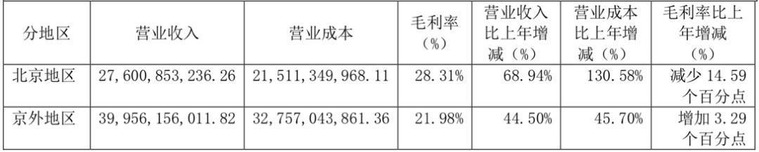 据中指研究院数据显示,2021年在北京市场,首开股份以628.8亿销售额位列榜首。尽管如此,该公司在北京地区项目的毛利率却仍出现大幅下滑。年报显示,报告期内首开股份北京地区毛利率为28.31%,较上年同期缩减14.59个百分点;其京外地区毛利率虽相对京内地区较低,但却有所增长,同比增加了3.29个百分点至21.98%。