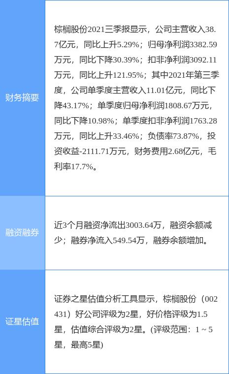 002431股票(002431股票行情)2月17日盘中消息,9点38分棕榈股份(002431)封涨停板。目前价格3.94,上涨10.06%。其所属板块基础建设目前上涨。领涨股为冠中生态。资金流向数据方面,上个交易日主力资金净流入5933.58万元,游资资金净流入4317.0万元,散户资金净流出3973.31万元。近5日资金流向一览见下表:棕榈股份主要指标及行业内排名如下:棕榈股份(002431)个股概况:以上内容由证券之星根据公开信息整理,如有问题请联系我们。