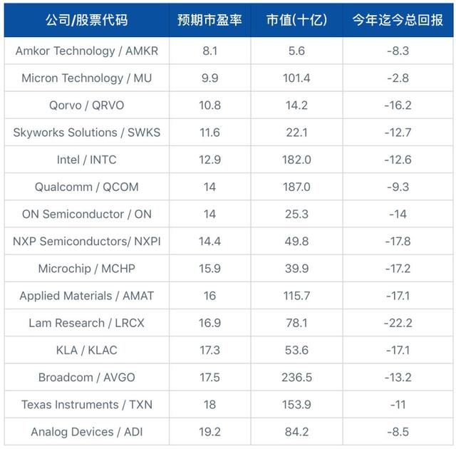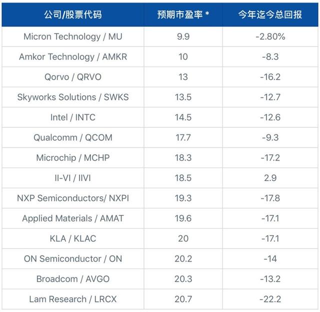 下表中是基于最近水平的SOX指数中15只最便宜的芯片股票。