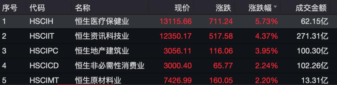 恒生行业指数中,医疗保健、资讯科技、地产建筑等板块涨幅居前。