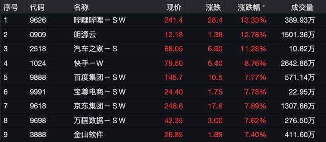 资讯科技板块中,哔哩哔哩涨超13%,快手涨8.76%,百度涨7.77%。