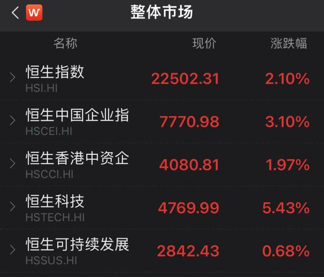 4月4日,港股大爆发。Wind数据显示,恒指高开高走,涨2.1%;恒生中国企业指数涨3.10%,恒生香港中资企业指数涨1.97%,恒生科技指数涨5.43%。