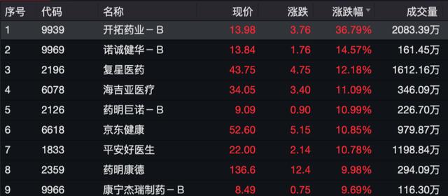 医疗保健行业成分股中,开拓药业涨超35%,盘中一度涨超40%。此外,诺诚健华、复星医药等涨幅居前。