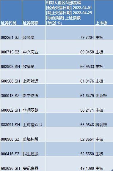 中兴商业(000715)、牧高笛(603908)、上海能源(600508)、新宁物流(300013)紧随其后,均跑赢大盘超60%,分别为69.35%、66.95%、61.92%、61.65%。