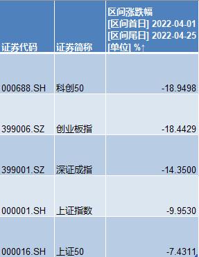 Wind数据显示,4月份至今,A股主要指数下行明显。其中,成长代表科创50和创业板指均跌逾18%。深证成指下行超10%,跌14.35%。