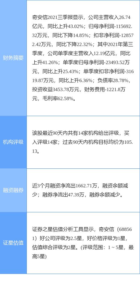 2022年3月31日,国元证券研究员耿军军发布了对奇安信的研报《事件点评:Q1营收增长超预期,新增订单同比高增》,该研报对奇安信给出“买入”评级,认为其目标价为119.12元,研报发布时股价为58.86元,预期涨幅为102.38%。研报中预测公司2021-2023年营业收入为57.37、80.33、106.97亿元,归母净利润为-5.11、-0.53、3.57亿元,EPS为-0.75、-0.08、0.52元/股。公司目前处于亏损状态,适用PS估值法。不考虑低毛利率业务(硬件及其他)的价值,预测2022年高毛利率业务收入为73.86亿元,上市以来,公司PS主要运行在7-27倍之间,考虑到近期市场整体估值水平的调整,下调公司高毛利率业务2022年的目标PS至11倍,对应目标市值为812.46亿元,目标价为119.12元。维持“买入”评级。证券之星数据中心根据近三年发布的研报数据计算,该研报作者对此股的盈利预测准确度为35.49%。