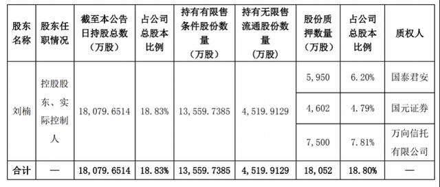 但是晚间,天海防务又发布公告称,公司实控人刘楠接到质权人国泰君安、国元证券的通知,因刘楠先生股票质押合约发生违约,国泰君安、国元证券拟对刘楠先生的质押标的证券及其所产生的权益通过违约处置卖出方式实现其债权。拟减持数量不超过刘楠先生所持公司全部无限售流通股份数,即不超过 45,199,129 股,占公司总股本的 4.71%,不超过刘楠先生持有公司股份的 25%。