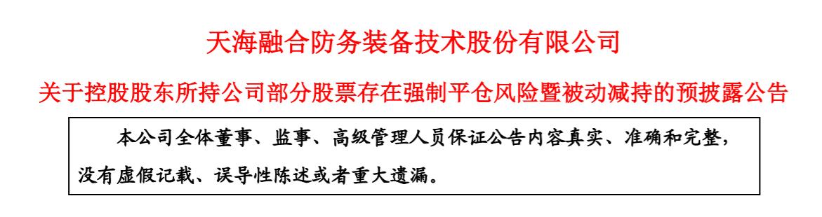 9月9日晚间,天海防务发布了关于控股股东所持公司部分股票存在强制平仓风险暨被动减持的预披露公告,称公司控股股东、实际控制人刘楠先生的通知,其质押在国泰君安证券股份有限公司、国元证券股份有限公司的部分股票可能将遭遇强制平仓导致被动减持。9月10日早盘,天海防务跌停。