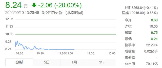 受实控人平仓消息的影响,今日午间收盘价为8.24元/股,跌幅为20%。目前,天海防务总市值在79.11亿元。