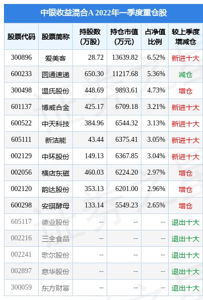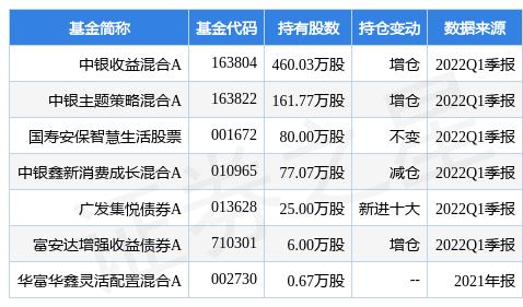 根据2022Q1季报基金重仓股数据,重仓该股的基金共6家,其中持有数量最多的基金为中银收益混合A。中银收益混合A目前规模为19.92亿元,最新净值1.3959(4月22日),较上一日下跌0.87%,近一年下跌8.77%。该基金现任基金经理为黄珺。黄珺在任的公募基金包括:中银主题策略混合A,管理时间为2019年3月13日至今,期间收益率为125.65%;中银鑫新消费成长混合A,管理时间为2021年9月6日至今,期间收益率为-14.62%;中银大健康股票A,管理时间为2021年11月4日至今,期间收益率为-21.53%。