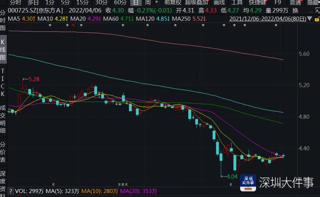 南都记者发现,截至2022年2月28日,京东方A股的股东户数已逾160万。但自2008年创下超12元的高价之后,这十多年来京东方A的股价长期徘徊于低位区间。截至2022年4月6日收盘,京东方A报4.3元,跌0.23%,总市值超1600亿。从市盈率来看,目前京东方A的动态市盈率为个位数,远低于电子元器件行业的均值。