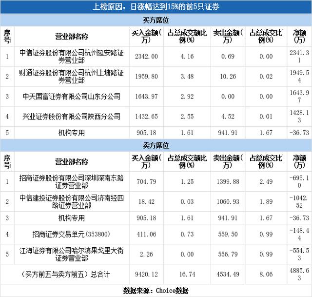 买四为兴业证券陕西分公司,该席位买入1432.65万元,卖出4.52万元,净买额为1428.13万元。近三个月内该席位共上榜91次,实力排名第21。兴业证券陕西分公司今日还参与了京运通(净买额5557.03万元)。