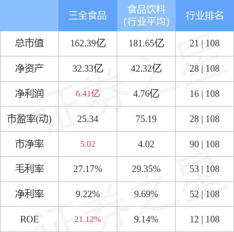 三全食品主要指标及行业内排名如下: