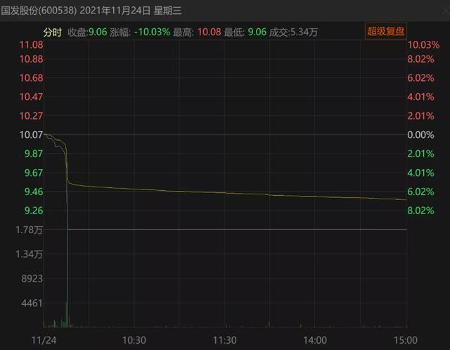 11月24日开盘后,国发股份平开低走,在9点44分之后迅速跳水、火速封死跌停。25日,国发股份再次出现一字跌停,截至收盘有高达51.67万手的封单。结合跌停价8.15元来看,当天封板资金高达4.21亿元。