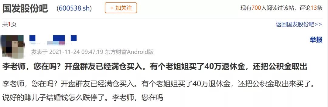 甚至有人表示,有个老姐姐40万退休金加上公积金都取出来买了国发股份,本想着给儿子赚结婚钱,结果跌停了。